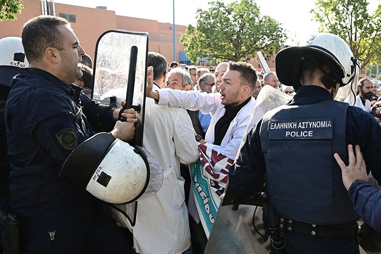 Εργαζόμενοι συγκρούστηκαν με την αστυνομία κατά την επίσκεψη του πρωθυπουργού και του υπουργού Υγείας