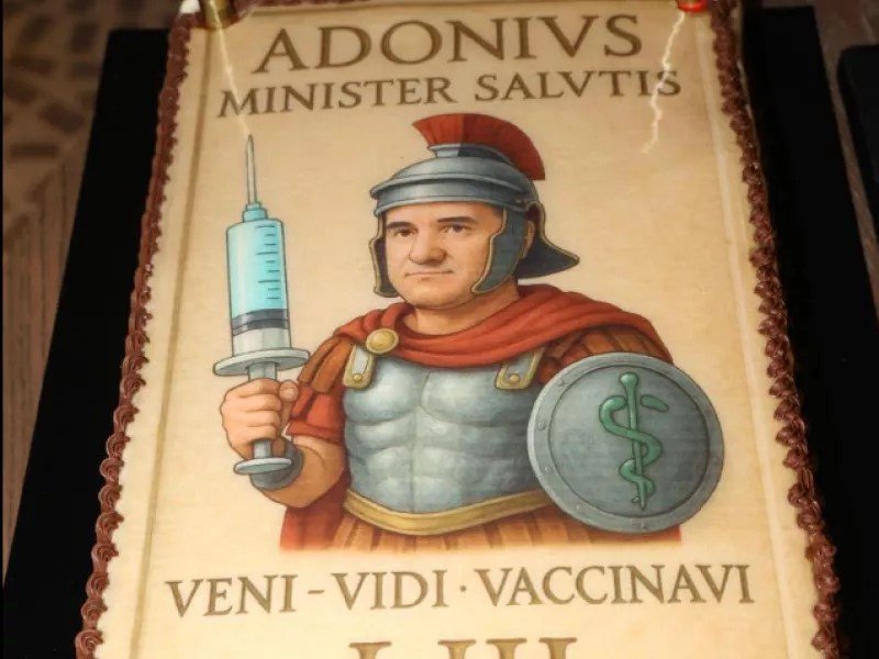 Στην τούρτα αναγράφεται το λατινικό μήνυμα: «Adonis Minister Salvtis – Veni Vidi Vaccinavi». Η φράση είναι παραλλαγή της γνωστής ρήσης του Ιούλιου Καίσαρα «Veni, Vidi, Vici» («Ήλθα, είδα, νίκησα»), προσαρμοσμένη με χιουμοριστικό τρόπο στον ρόλο του υπουργού Υγείας και στην περίοδο των εμβολιασμών: «Ήρθα, είδα, εμβολίασα».